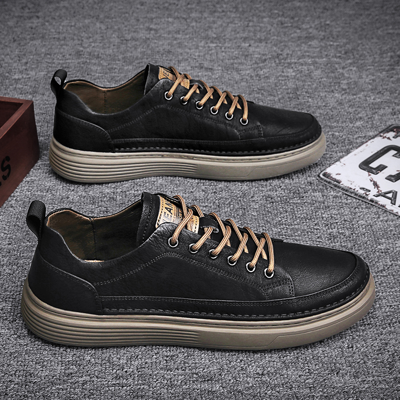 These black leather casual shoes combine elegance and functionality, featuring a classic design and refined materials, making them perfect for daily commutes and casual occasions. The premium synthetic leather upper delivers a smooth texture, is easy to clean, and offers long-lasting durability. Brown lace accents add a vintage touch, perfectly complementing the earth-tone outsole. The minimalist yet stylish design is paired with a lightweight, high-elastic sole for excellent cushioning and long-term comfort.
