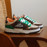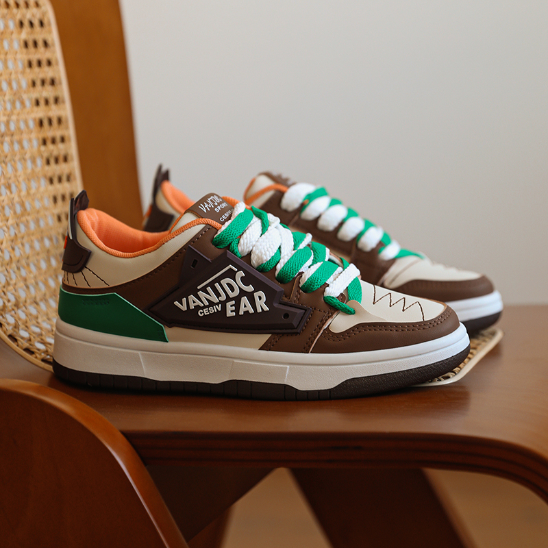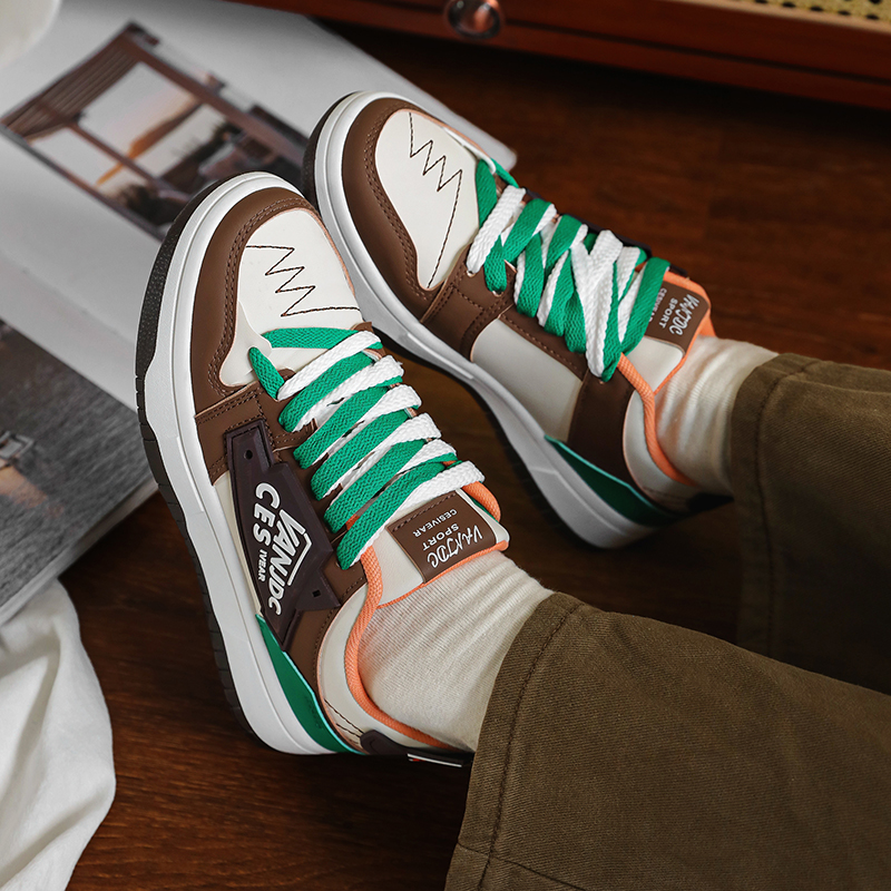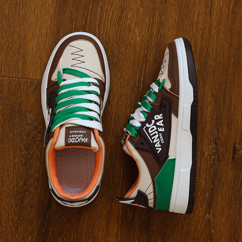 This trendy and stylish sneaker features a unique color-blocking design, with brown and beige as the main tones accented by striking green details, creating a distinctive and eye-catching look. The upper is made of high-quality synthetic materials, offering both breathability and durability to ensure all-day comfort. The thickened sole provides excellent cushioning and enhanced support, making it perfect for everyday wear or light exercise. The side of the shoe features personalized logo designs and textured details, adding a touch of street fashion. Whether paired with casual or athletic wear, these sneakers will make you stand out in the crowd!