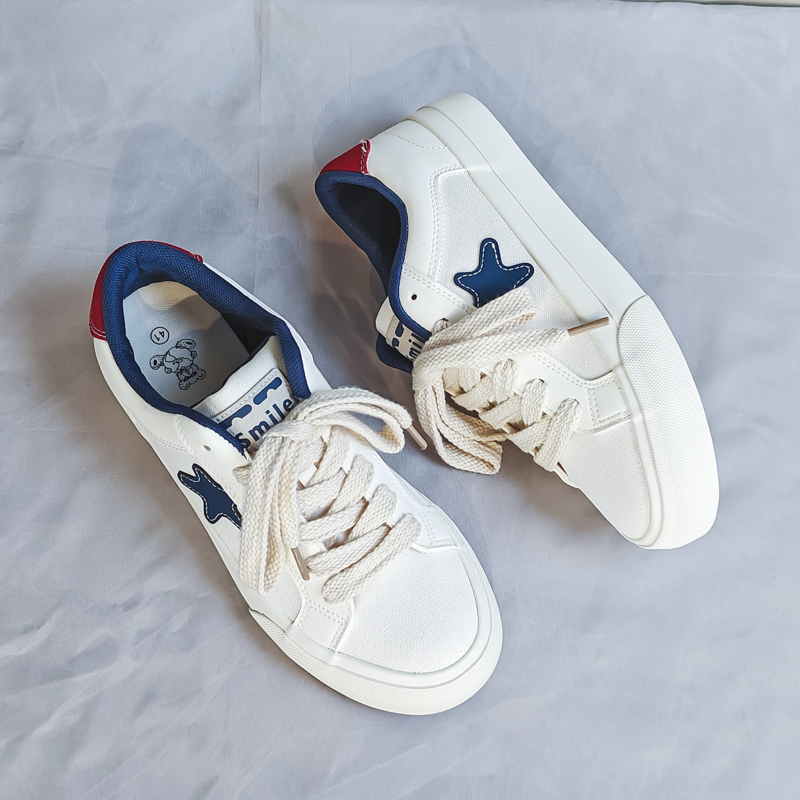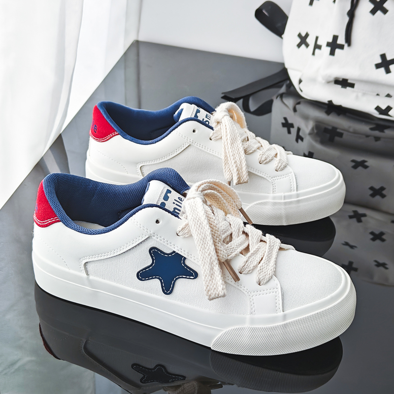 These stylish low-top canvas shoes feature a simple yet energetic design, perfect for those who value comfort and fashion. The soft canvas upper is breathable and lightweight, with a standout blue star decoration and a red heel accent that adds personality and a vibrant touch, making it easy to create a trendy look.