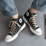 These vintage high-top canvas shoes feature a classic black base accented with beige laces and brown details, offering a stylish retro vibe. The upper is crafted from premium canvas material, providing breathable comfort and durability for all-day wear. The thick rubber outsole ensures excellent stability, grip, and wear resistance, while the signature-style design adds a unique touch. The high-top construction offers both warmth and style, making these shoes perfect for pairing with jeans, casual pants, and more. Ideal for daily wear and street fashion, they’re a must-have for any wardrobe.